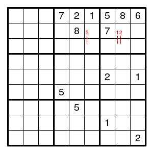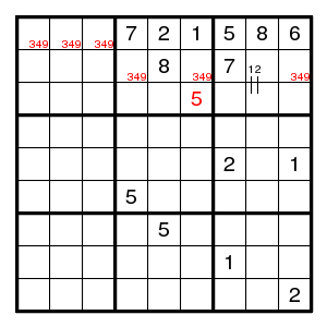 Here the top row is known except for the three digits 3, 4, 9 that must occur in the top left box. These digits must also occur on the second row, and there are only three available places. So these three places contain 3, 4, 9, and the 5 must be on the third row. Another example is given later.