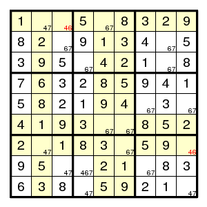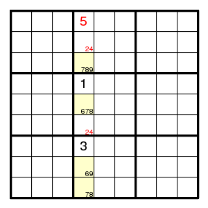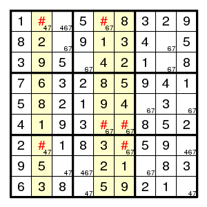 Here the possibilities for the fields in column 4 are given. Note the four yellow fields: together, they only have the four possibilities 6, 7, 8, 9. So, these yellow fields contain 6, 7, 8, 9 in some order, and we can remove 6, 7, 8, 9 from the possibilities of the other fields in that column.