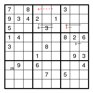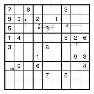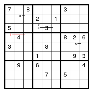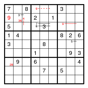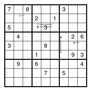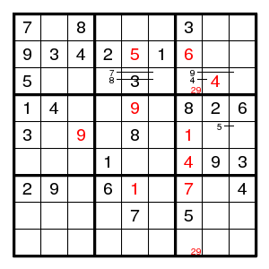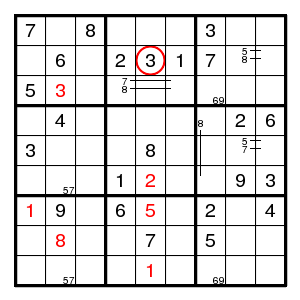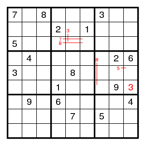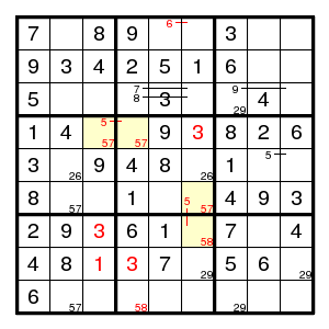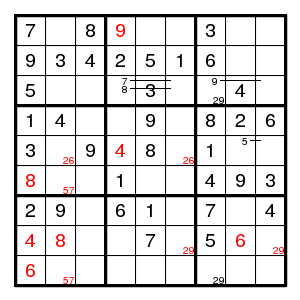 It really disappoints: we can immediately find several pairs and even a plain digit. Not *that* difficult. But then we are stuck. So let us guess, at a place where there are not that many possibilities. Since I know the solution, I can make sure that we always make the wrong guess first. Let us guess that the 3 in the middle top box is at (2,5).