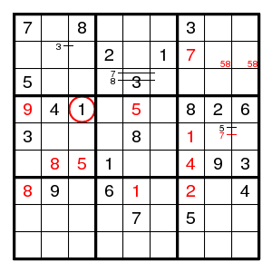 We find (4,1)9, (4,5)5, a double pair 58 in row 2, (2,7)7, (6,7)4, (5,7)1, (7,7)2, (7,5)1, (7,1)8, (6,2)8, (6,3)5, and there is no room for a 7 in box 4 anymore. So we guessed wrong and 1 is at (4,1).