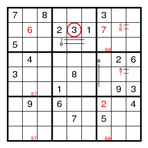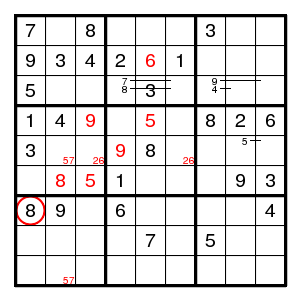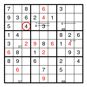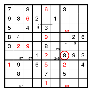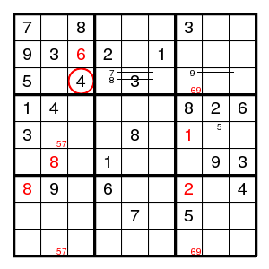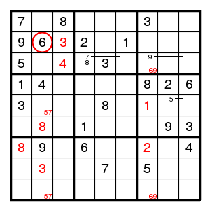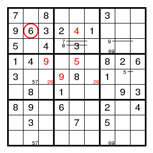We find (2,3)6, a double pair 69 in column 7, (7,7)2, (5,7)1, (7,1)8, (6,2)8, a double pair 57 in column 2, all very familiar. Next (6,1)6, (5,6)6, (8,2)6, (1,5)6, (5,3)2, (5,4)9, (9,5)9, (6,5)2, (2,5)4, (5,8)4, and there is no place for a 4 in column 7. So we guessed wrong and this 4 is at (2,3).