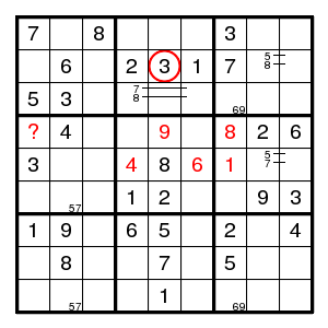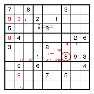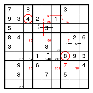 We find (4,1)8, (2,1)9, encounter a 3-set 246 in box 5, a double pair 57 in row 6 and in column 2, then (8,2)8 and (2,2)3. But what next? One more guess. Let us guess that 4 is at (2,3).