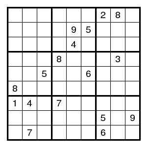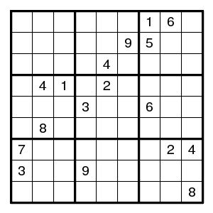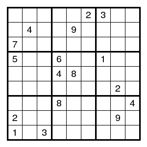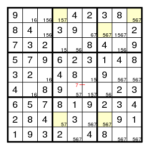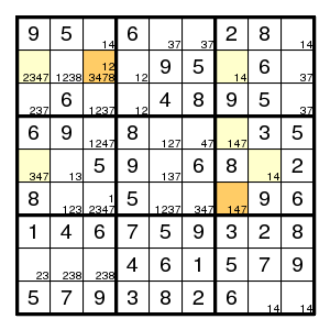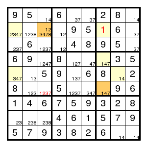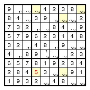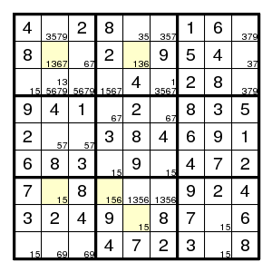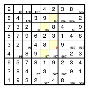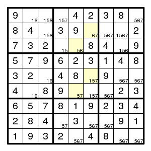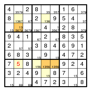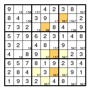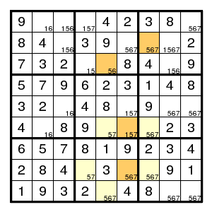 The starting configuration leads without problems to the situation on the right. None of the techniques mentioned so far will work here. But there is an odd cycle, here a pentagon, indicated in yellow, of positions that all might contain the same digit 1. By the argument above, there is an edge in the pentagon such that both vertices are different from 1. Now the edge (2,2)-(2,5) must contain at least one 1, since there are no other 1's in that row. Thus an edge where 1's are absent must be one of (2,5)-(8,5), (8,5)-(7,4), (7,4)-(7,2) or (7,2)-(2,2). Alternative choices in the corresponding row, column or box are the (orange) positions (7,5), (7,6) and (3,2), and we know that at least one of them must be 1. But then a common neighbour of each of the alternatives cannot be 1, and in our example (7,2) is such a common neighbour. Therefore (7,2) is not 1.