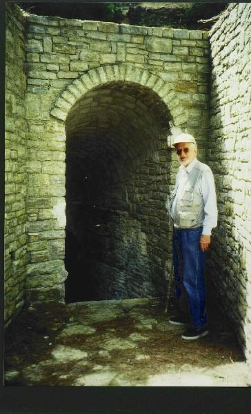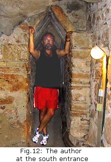 Then on Tuesday we went up to the south entrance to the tunnel itself. (I remembered how hard it was to find 30 years ago, in contrast to today when there are signs and even a road.) The guard gave us keys and off we went (with a slight hitch, quickly repaired, since he had given us the wrong keys). The next part is hard to describe, simply because walking in a tunnel is not the sort of experience many of us have often. It varies in size and is normally about square in cross-section, maybe 1.5 m by 1.5 m - that is, 5 ft by 5 ft - or even more. But often it assumes other shapes: sometimes very narrow, just wide enough for one person, and perhaps almost as tall as a man; other times it becomes higher and we could stand up straight in it; however once in a while it is less high, not much over a metre. In my memory of 20 or more years ago, the tunnel was a dirtier and messier place, much narrower, and of course totally dark: today much of it is illuminated by lights along the ground, every 10 or 15 metres, that made a very attractive pattern disappearing in the distance in the places where it ran almost straight for a while. It was always dark: the lights simply broke the darkness. Clearly it has been much cleaned out, and the low sections are places where the floor was covered with earth that probably could be removed some day. On one side there is a discontinuous ditch, and when we peered down this ditch, using our lights, we could see the other tunnel 10 or 12 metres, 35 or 40 feet, below. This ditch had been one of my great fears when I entered the tunnel in the past, but now all the open stretches were covered by a sort of grill: an object (or a small child) could easily fall through, but an adult would have to work at it: this was a great comfort (yet one had to feel that some authenticity had been lost too).
