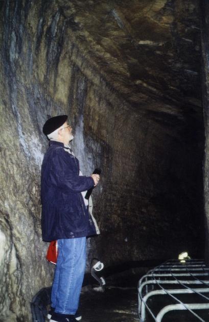 The tunnel ceiling was much higher for a while after that as we headed north, and here we met a bat. The bat was more upset by us then we were by it, and kept fleeing ahead of us, then turning and trying to get by - which Jean and I certainly wanted it to do. Finally, flattening ourselves against one wall, we freed enough space for the bat to return to what may have been its home. We wondered what the bat could eat in the middle of such a tunnel (when we asked the guard about this after coming out, he told us that there were other creatures in there, for instance snakes). Shortly after the bat the illumination, such as it was, stopped and our lights were our only accompaniment.