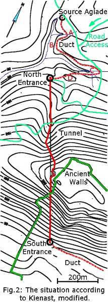Kienast's papers and books were available in Brussels and Jean made a copy of a good bit of the most relevant work. Here we learnt a great deal that we had not realised. For instance, there are two tunnels really: the upper one, that can be walked through, and the lower one, as much as 10 or 12 metres further down, containing the terra cotta pipes for the water, with frequent shafts from the upper one down to the lower one. (In fact Herodotus contains this information too, but I at least did not absorb that: I had somehow drawn the conclusion from my visits that the water course was a few feet down in the ominous ditch that ran on one side of the upper tunnel.) And the lower one is in fact much longer, for it runs several hundred metres through the pine forests on the northern slope of the mountain from the spring Agiade before reaching the tunnel proper, and then runs a fair distance on the south side before finally feeding tanks and cisterns there, inside the ancient city. These extensions of the water-course were probably dug as ditches and then covered over, unlike the tunnel through the hill. Kienast gave quite detailed maps of the lines of these various water-courses, as well as very accurate information about the tunnel - or better, the two tunnels.