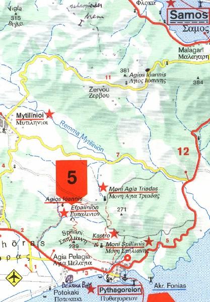 The Greek island of Samos is close enough to the Turkish coast that a really strong swimmer could make the crossing easily I think. Samos is unusual for Greek islands in having a lot of forests, and is probably more prosperous than the average Greek island too. This prosperity existed already before tourism reared its head after WW2, and has only been increased by the Germans and Dutch and English and French visitors during the past half century. In the 7th and 6th centuries B.C. Samos was an important part of Greece, prosperous then too, with a much admired capital city and with many cultural achievements: Pythagoras came from here. The walls enclosed a city, on the south coast and then called Samos also, that stretched more than 1500 metres - about a mile - west from its harbour and had a North-South width of 750 metres, half a mile, between its southern edge, the sea, and the high ground to the north. The village on that site today clusters around the harbour and occupies no more than one-tenth of the area of the ancient city, and is no longer called Samos: that name is reserved for the more important newer town over on the north side of the island, where the Piraeus ferry-boats land and where the island's business activities are largely concentrated. Besides tourists, the present village exploits fishing.